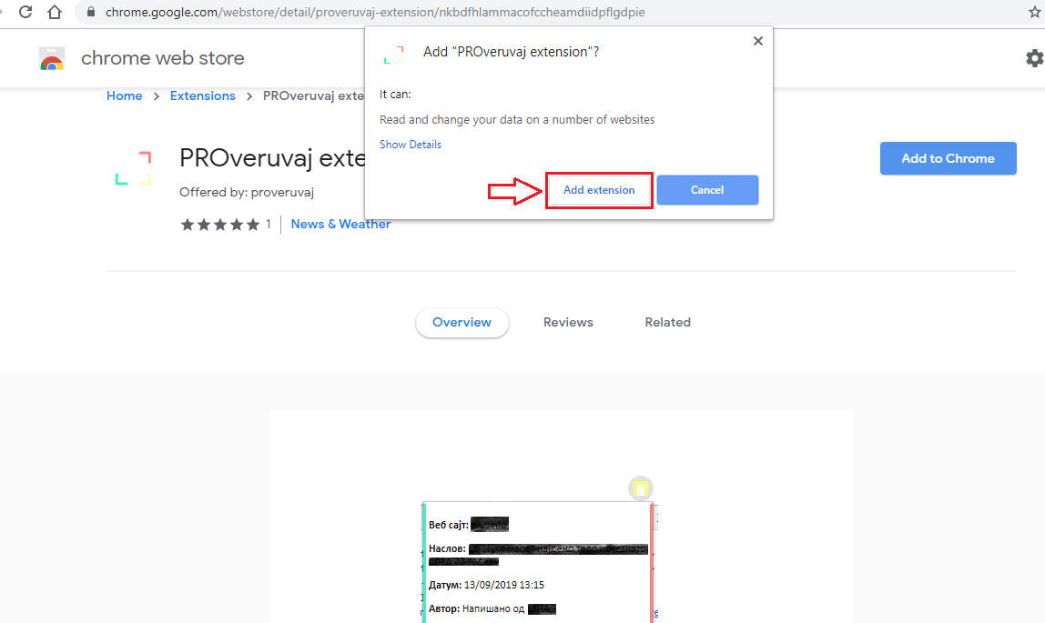 Потоа пребарувачот ќе ве праша дали сте сигурни дека сакате да ја инсталирате екстензијата, со назнака дека може да ја гледа содржината на некои од страниците. Со повторно избирање на Add extension, екстензијата ќе се инсталира на вашиот Google Chrome прелистувач.
